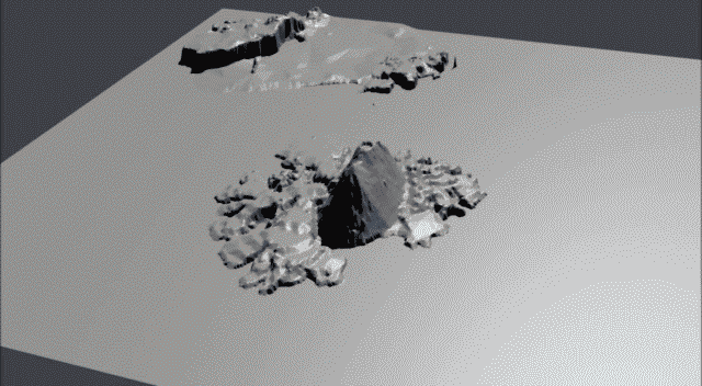 これは、西ノ島のいくつかの時点における標高計測データから3次元モデルを作成し、各時点の間をスムーズな移行となるように連続なアニメーションとして生成し、動画にしたものです。